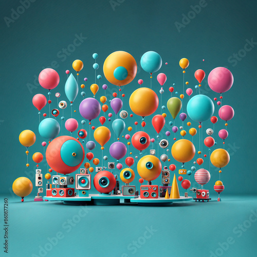 3D rendered like illustration of a party ambience, big sound systems and colorful balloons,