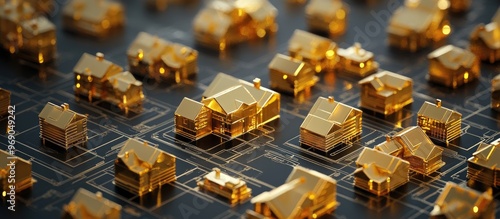 3D rendered visualization of a cluster of houses constructed from gold bars illustrating a luxury living concept