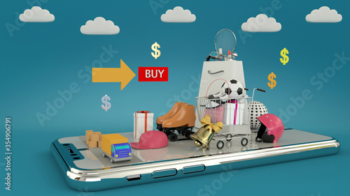 3d rendering. 3d Illustration Smartphone to enter content surrounded by shopping bags, shopping carts on background.