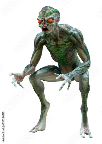 3D Rendering Green Alien on White