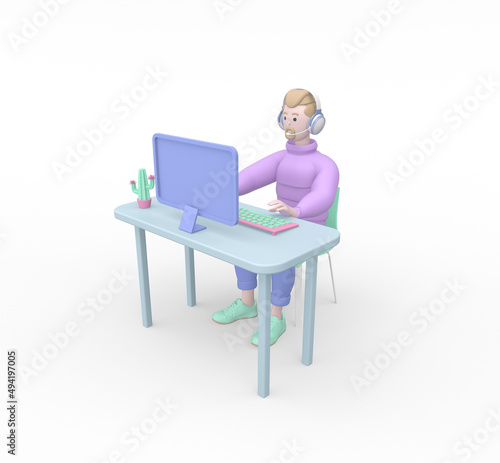 3d rendering illustration of working process at home. Man sitting at the table and working on the computer.