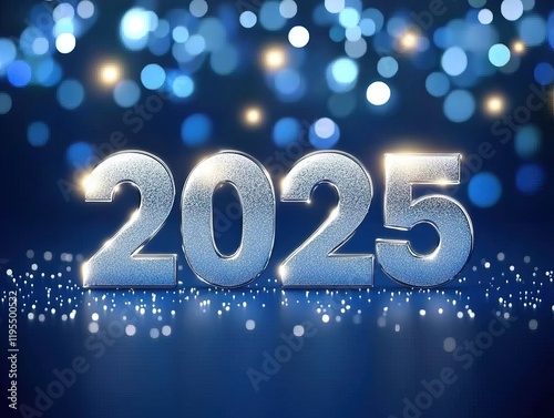 3D rendering of "2025" on blue background with bokeh lights, glowing silver numbers for New Year or Christmas party celebration, shiny text effect, vector illustration, high resolution