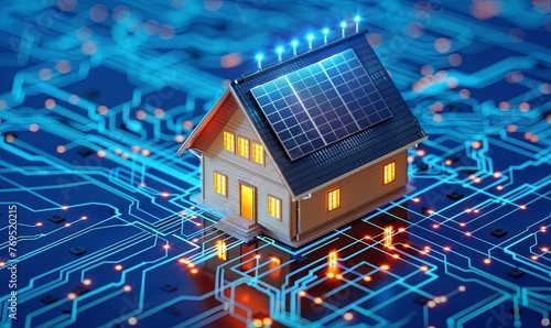 3D rendering of a house with solar panels on the roof and a digital glowing circuit board background