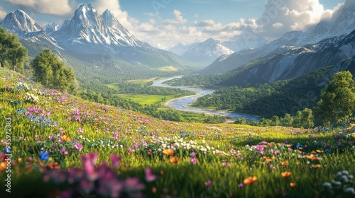 3D rendering of a lush green valley with wildflowers, a winding river, and distant mountains.