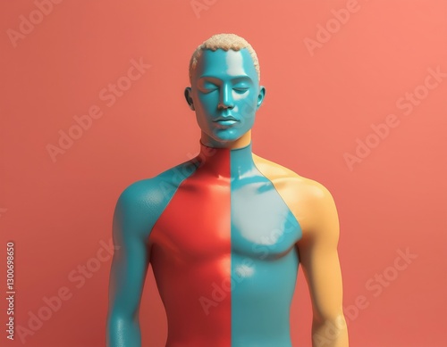 3D rendering of a male figure, painted in a bold color block style. The figure's body is divided into sections of blue, red, and yellow, creating a striking visual contrast.