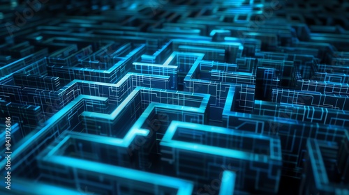 3D rendering of a maze. The walls are made of shiny metal and the floor is made of a dark material.