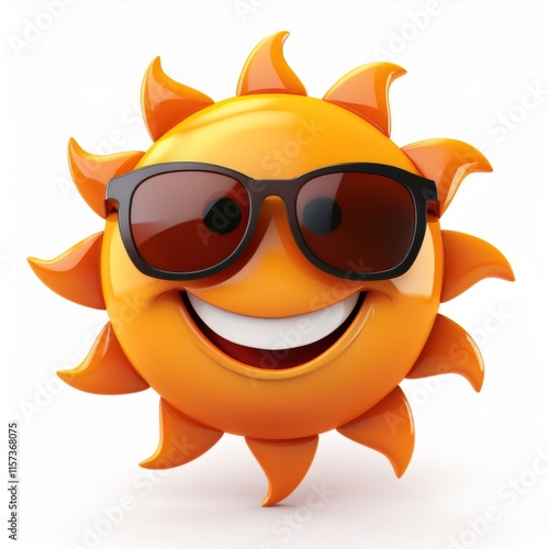 3D rendering of a smiling cartoon sun wearing sunglasses, isolated on a white background with full depth of field