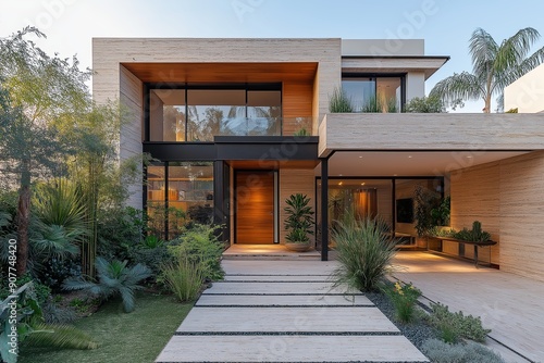 3d rendering of modern cozy house with garden and beautiful landscaping, entrance