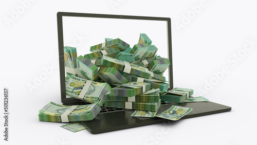 3D rendering of Sierra Leonean leone notes coming out of a Laptop monitor isolated on white background. stacks of Sierra Leonean leone notes inside a laptop. money from computer, money from laptop