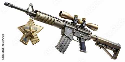 3D Rifle and Military Badge Floating in Mid-Air � Symbolizing Strength and Sacrifice of Veterans on Isolated White Background