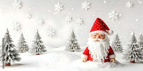 3D Santa Minimalist Winter Scene with Snowflakes and Trees � Seamless Cartoon Design on White Background for Versatile Copy Space