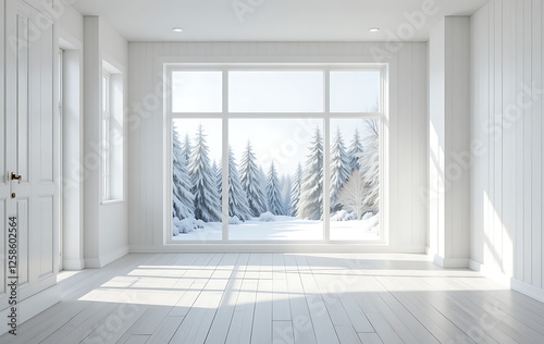 3D-rendered a white empty room with a winter landscape visible through window