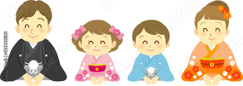 イラスト素材:着物姿の家族4人が新年のご挨拶を正座でする様子 にっこり目セット(透過背景)