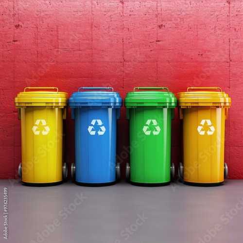 4 Colorful garbage cans in different colors, with recycling symbols on them, lined up along the wall.