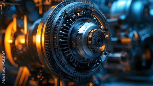 49. **3D render of a high-torque industrial engine with visible gear assembly and large cooling fans