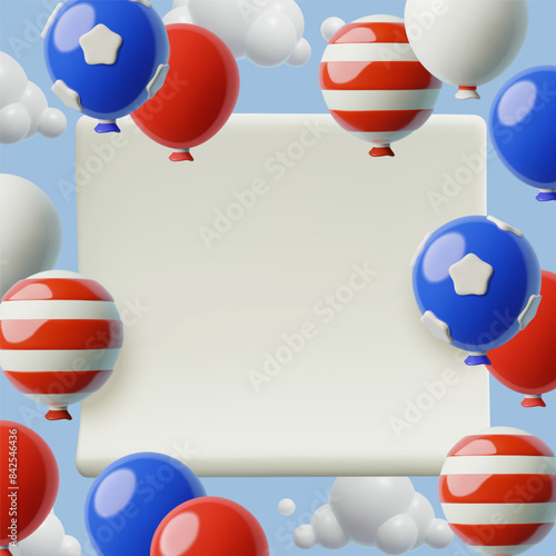 4th July 3d square background for sale and social media post. USA Independence Day holiday banner with blue, red and white flying balloons, clouds and copy space.