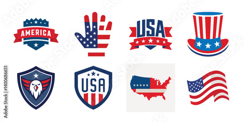 4th of July vector elements set. Collection of American Independence Day vectors, shield, banner, hat, sunglass, map collection