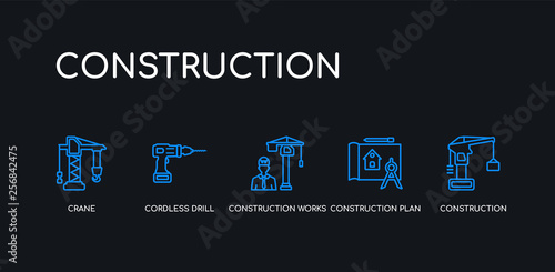 5 outline stroke blue construction, construction plan, construction works, cordless drill, crane icons from collection on black background. line editable linear thin icons.