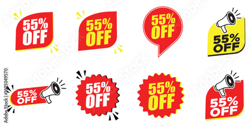 55% Off Sticker Set – 55% Off Discount Labels with Megaphone Icons for Promotions