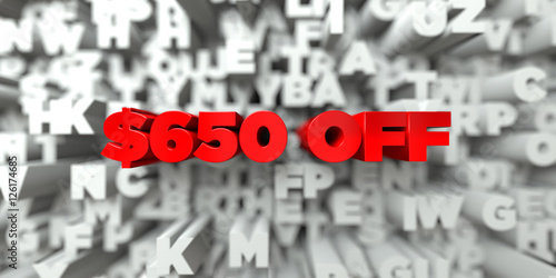 $650 OFF - Red text on typography background - 3D rendered royalty free stock image. This image can be used for an online website banner ad or a print postcard.