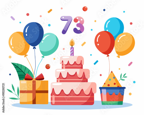 73 Birthday Vector With Cake, Balloons And Confetti