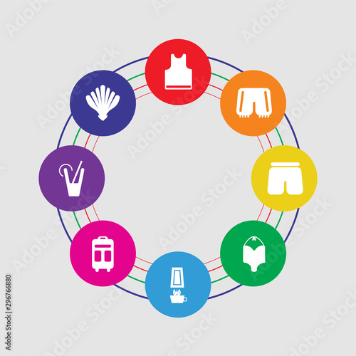 8 colorful round icons set included seashell, cocktail, backpack, lantern, swimsuit, swimsuit, shorts, sleeveless