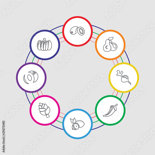 8 colorful stroke icons set included pumpkin, coconut, artichoke, lemon, chili, radish, avocado, kiwi
