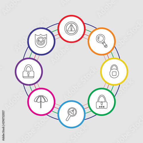 8 colorful stroke icons set included shield, lock, umbrella, problem, password, safe, find, warning