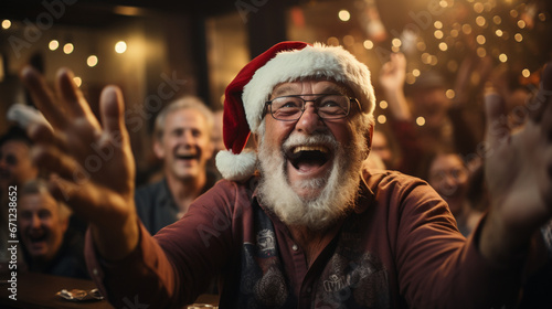 80 year old happy old man celebrating Christmas in pub wearing a santa claus hat