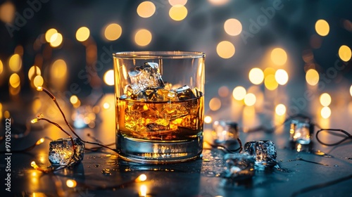 83. A glass of whiskey with ice cubes, illuminated by a background of lights. The whiskey is rich in color, and the ice cubes are clear and detailed, creating a refined and inviting visual
