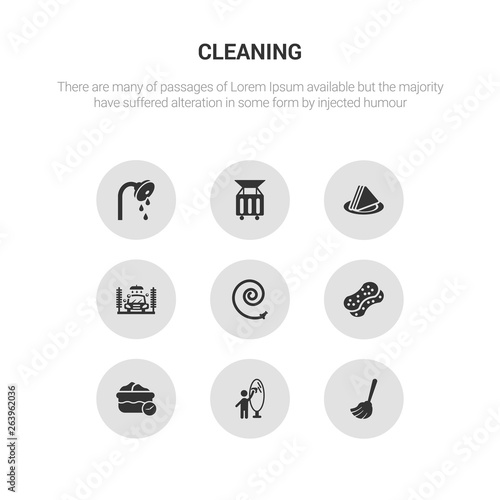 9 round vector icons such as floor mop, glass cleaning, water soak, sponges, garden hose contains car wash, serviette, dumpster, shower head. floor mop, glass cleaning, icon3_, gray cleaning icons