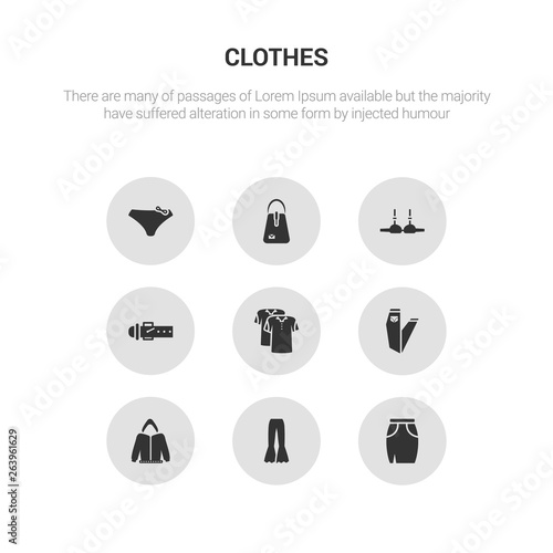 9 round vector icons such as skirt, trousers, hoodie, jeans, polo shirt contains belt, bra, hand bag, panties. skirt, trousers, icon3_, gray clothes icons