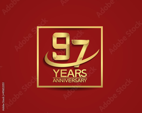 97 years anniversary with square and swoosh golden color isolated on red background can be use for special celebration moment