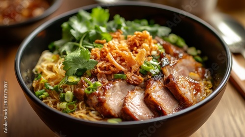 99. Bowl of Bakmie Khek with tender slices of pork, egg noodles, and green vegetables, topped with fried onions and cilantro, presented on a wooden table