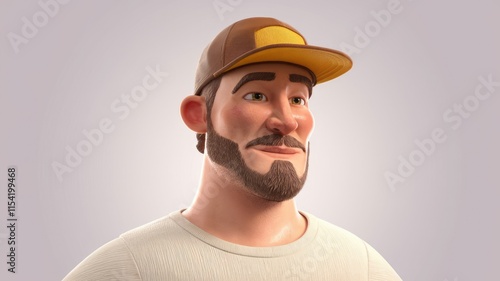 A 3D cartoon man with a beard, wearing a beige sweater and a brown cap, looks off to the side.