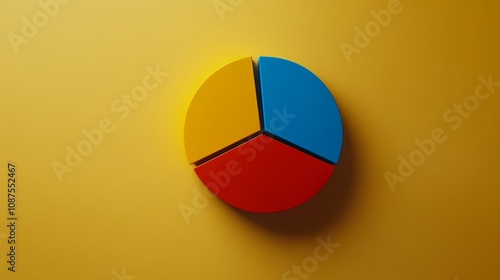 A 3D pie chart with three slices in red, blue, and yellow on a yellow background.