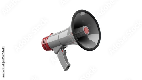 A 3D rendered megaphone, silver and red, with a modern design, used for making announcements or amplifying sound. background removed