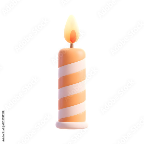 A 3d single lit orange and white striped birthday candle with a glowing flame isolated on transparent background