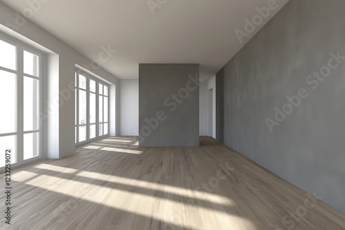 A 3D visualization of a retro-modern living room featuring an unoccupied interior with gray walls and wooden floors.