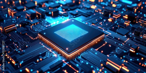 A 3D-rendered high-tech chip, glowing in an electric blue digital environment