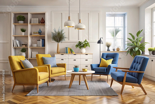 A angle of the living room with blue and yellow chairs, showing a bookshelf and large windows, creating a cozy, well-lit space for relaxation