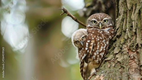 A baby owl perched on its mother's back in a tree.