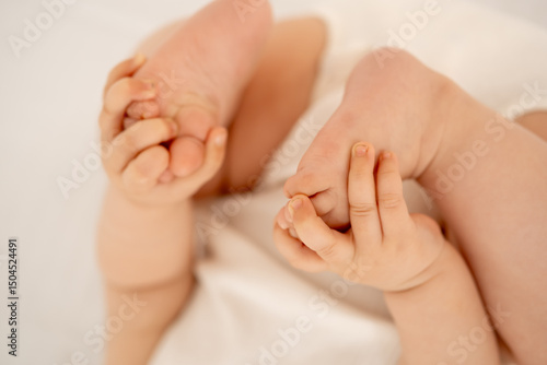A baby plays with his legs on a white bed at home, a smiling baby in close-up on the bed before going to bed