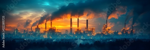 A background of glowing factory smokestacks silhouetted against a twilight sky.