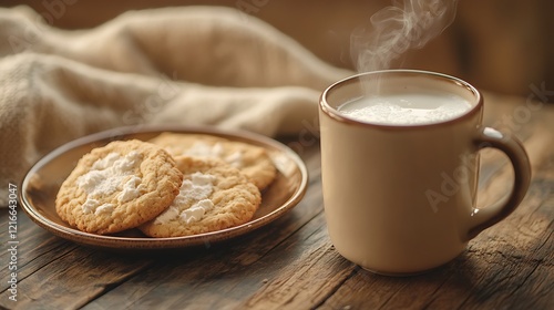 A bag of premium powdered milk placed next to a steaming mug of milk and a plate of fresh cookies on a wooden table