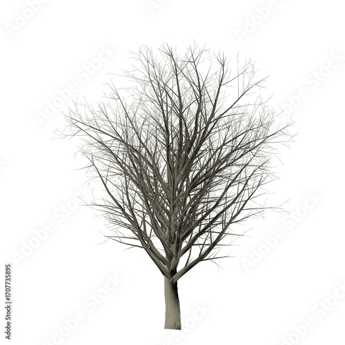 A bare tree with many branches is centered on a black background with a light colored trunk at the bottom