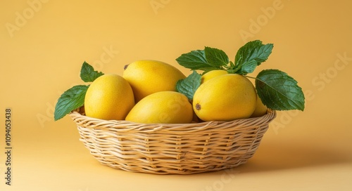 A basket of ripe yellow lemons with green leaves against a soft yellow background.
