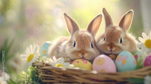 A basket with adorable rabbits, each with soft fur and fluffy ears, is surrounded by colorful Easter eggs and spring flowers.