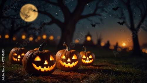 A bats flying in the night sky on a full moon on Halloween, Jack-o'-lantern pumpkins are light on the ground