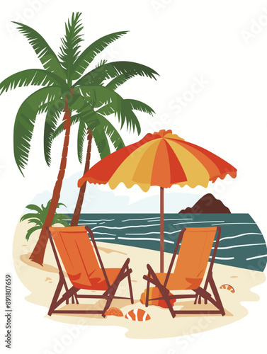 A beach scene with two orange chairs and an umbrella. The chairs are facing the ocean and the umbrella is providing shade. Scene is relaxed and peaceful
